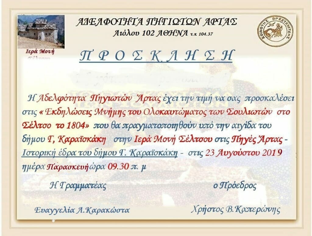 ΑΔΕΛΦΟΤΗΤΑ ΠΗΓΙΩΤΩΝ ΑΡΤΑΣ: ΓΙΟΡΤΕΣ ΣΕΛΤΣΟΥ 23-8-2019 19/08/2019 Άλλοι Φορείς ΔΕΙΤΕ ΤΟ ΠΡΟΓΡΑΜΜΑ ΤΩΝ ΕΚΔΗΛΩΣΕΩΝ ΕΔΩ