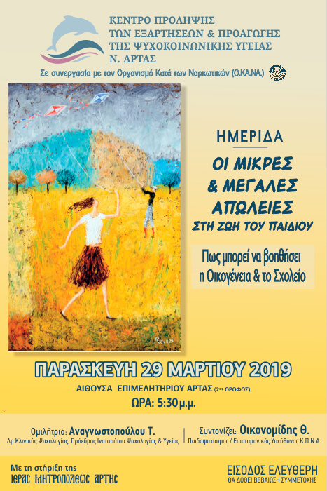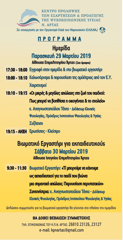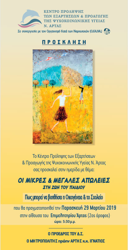 Πρόσκληση σε ημερίδα με θέμα: “ΟΙ ΜΙΚΡΕΣ & ΜΕΓΑΛΕΣ ΑΠΩΛΕΙΕΣ ΣΤΗ ΖΩΗ ΤΟΥ ΠΑΙΔΙΟΥ” 18/03/2019 Άλλοι Φορείς